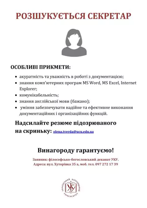 Друзі, ми шукаємо секретаря в деканат ФБФ УКУ. Можливо хтось із ваших знайомих шукає роботу. Прошу про репост!